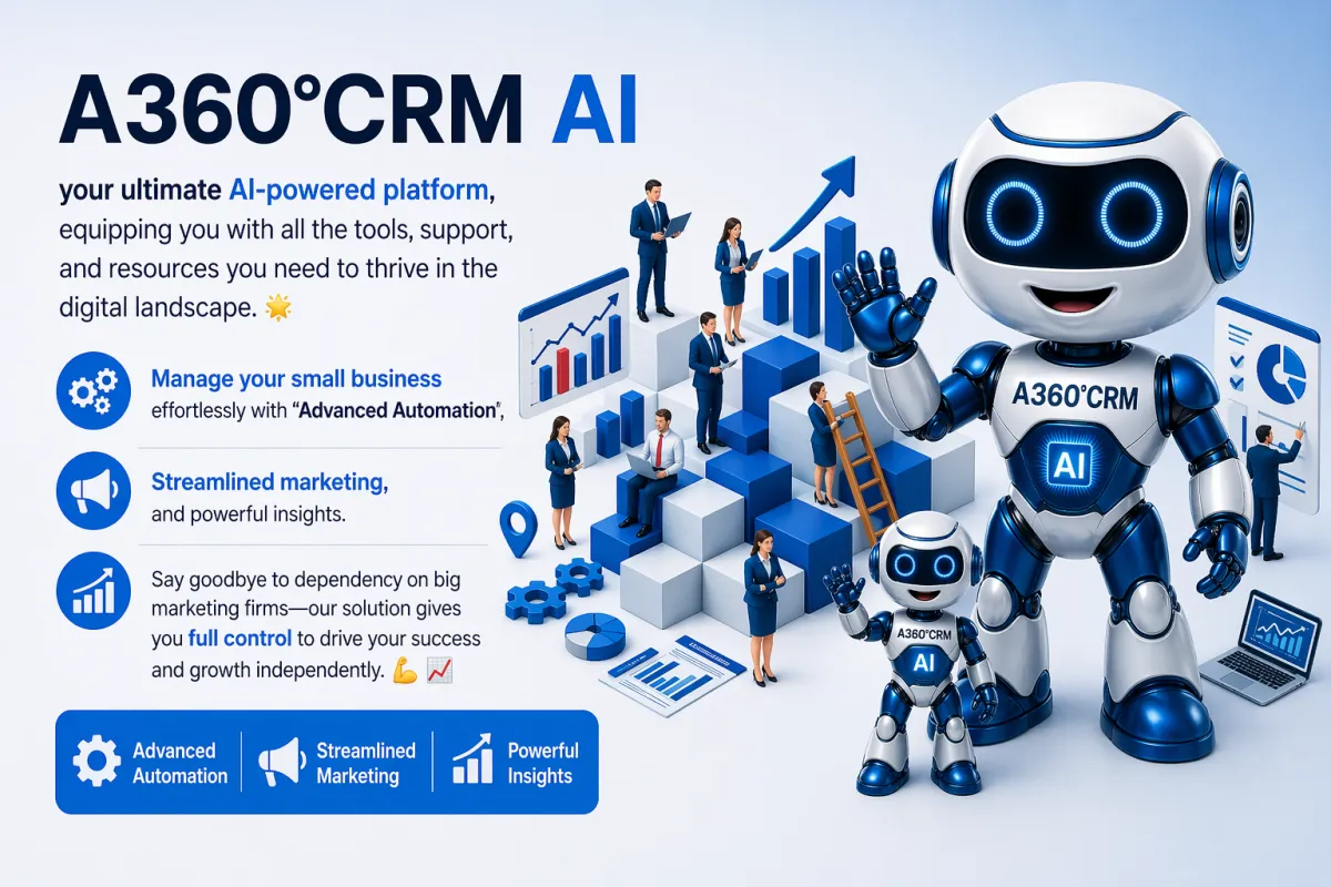 A360°CRM AI your ultimate AI-powered platform, equipping you with all the tools, support, and resources you need to thrive in the digital landscape. 🌟 Manage your small business effortlessly with "Advanced Automation", Streamlined marketing, and powerful insights. Say goodbye to dependency on big marketing firms—our solution gives you full control to drive your success and growth independently. 💪📈